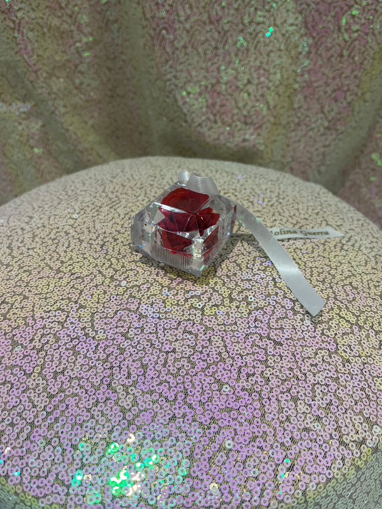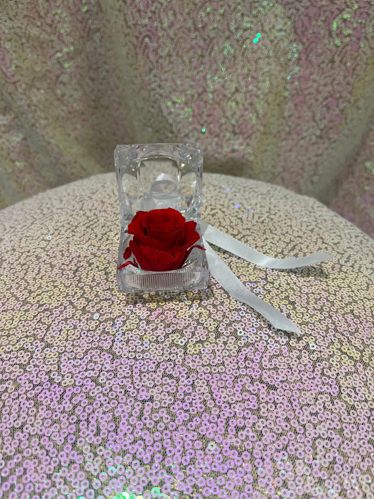 Une petite rose éternelle (une vrai rose traitée qui ne fanera pas) dans un petite boîte en acrylique transparente et ruban personnalisé.