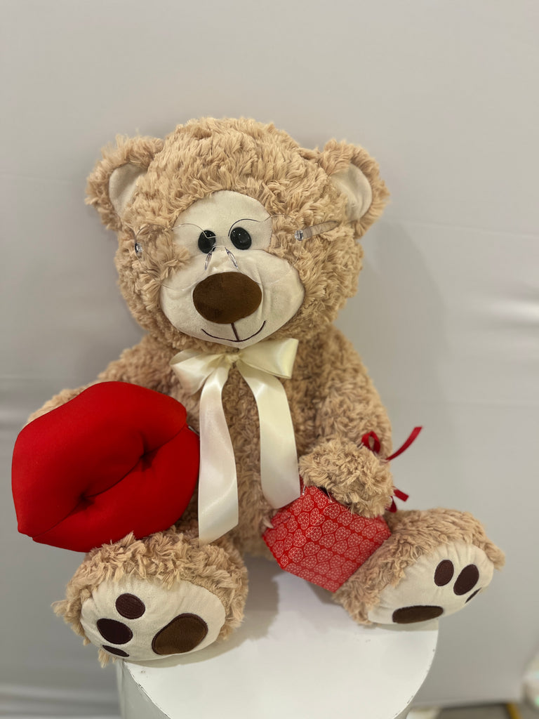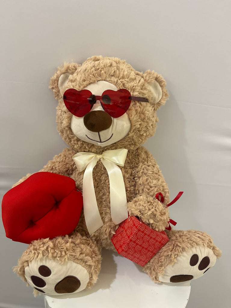 ourson couleur crème avec une paire de lunette en forme de cœur et une petite boîte de chocolats dans une patte et dans l’autre des lèvres prête à donner pleins de bisous! Pourrez-vous lui résister ?
