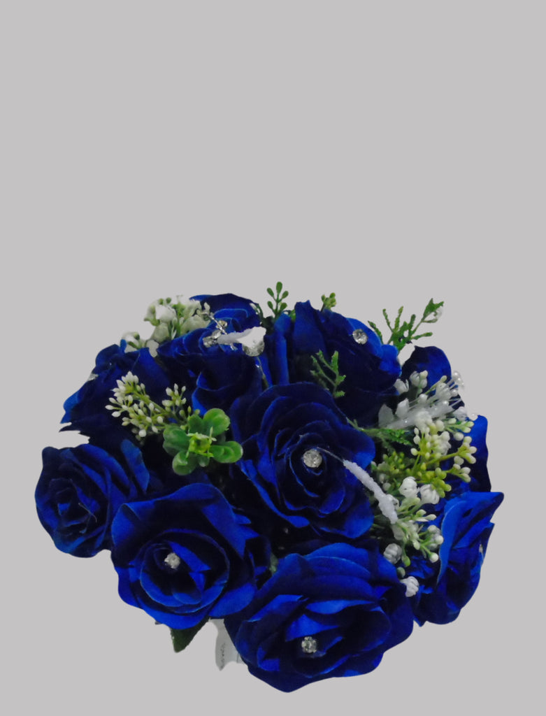 Ce superbe bouquet de roses bleues en soie est parfait pour la mariée ou son cortège. Élaborées à partir de fleurs de soie de qualité. Le mélange de feuillage et les roses bleu roi offrent un look élégant que vous adorerez. Une attention unique et spéciale qui fera fondre le cœur des époux.