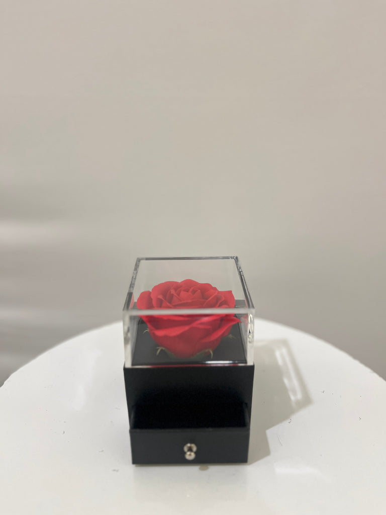Jolie boite rouge avec une rose artificielle sur le dessus