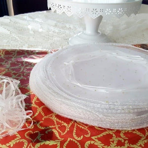 25 ou 50 tulles blanc avec bordure brillante avec ruban en satin, pour vos bonbonnières.